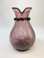 - Vaas - MuranoglasMurano glazen vaas in transparant amethistkleurig glas met craquelé-afwerking, hals en voet donkerpaars; hoogte 25 cm, breedte 17 cm, diepte 17 cm; gedateerd op 1970–1980; oorsprong murano, italië; in