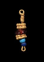 VandaagTopzoekertjeHana OrAntwerpen - West-Aziatisch Goud Hanger met glazen, gouden enWest-aziatische gouden hanger met een stapel kralen van goud, glas en granaat, daterend uit circa het eerste millennium v.chr.; Met een ophanglus en circa 2,2 cm lang, 0,7 cm breed en 2,42 g zwaar. Ee