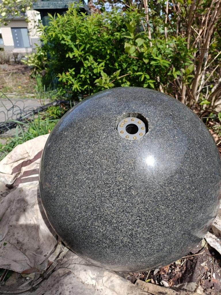 17 apr 26lindalievensSchendelbeke - Grijze granieten gladde bolGrijze granieten zware bol met licht en mogelijkheid voor waterfontein. Pomp niet bijgeleverd maar vind je in elke doe-het-zelf winkel. Diameter 40cm. Echte blikvanger in je tuin of aan een vijver.Ophalen