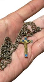 GisterenNikkiBuggenhout - Imposant Gotisch hangend kruisbeeld Lumen in Tenebris –Specimen: gotische hangkruis in bronzen brons met blå ultramarijn glaasglas-enamiel, 14,26 g, uit het midden van de 20e eeuw, uniseks, in discrete staat met zichtbare gebruikssporen, geen laboratorium