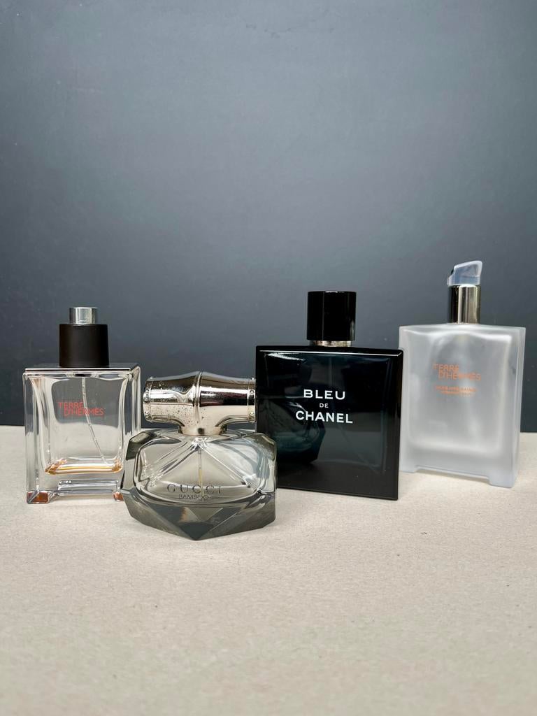 - ParfumflesjesEinde collectie: 5 originele lege parfumflesjes – terre d’hermès (parfum en aftershave balm), bleu de chanel, gucci bamboo en azzaro wanted.Gebruikt Ophalen of Verzenden