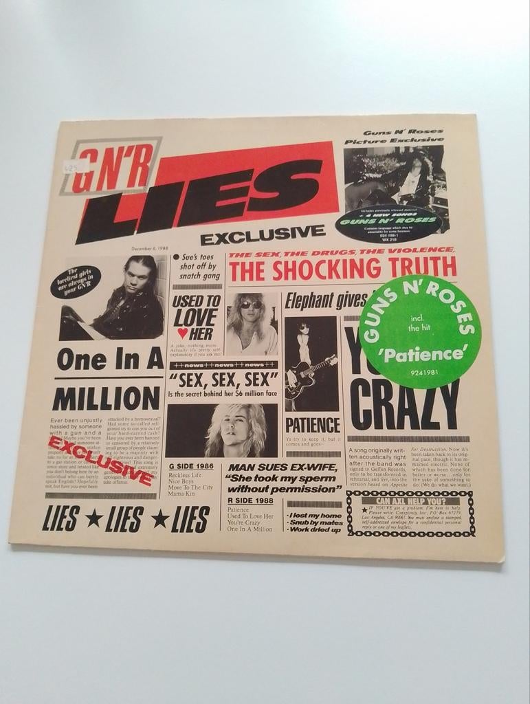 18 dec 25TopadvertentieScheerHGHeel België - Guns N Roses – G N R LiesTracklist g side 1986 a1 reckless life a2 nice boys a3 move to the city a4 mama kin r side 1988 b1 patience b2 used to love her b3 you're crazy b4 one in a million notes a black sticker with whiteGebruikt