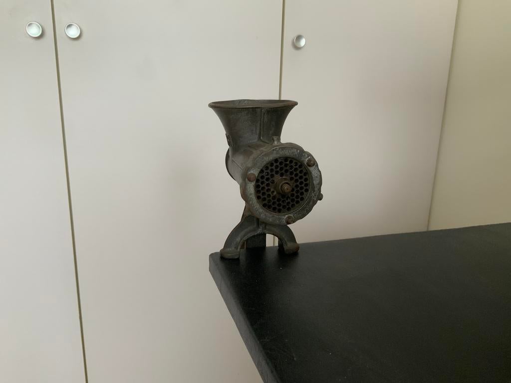 11 mrt 26Matteo FerraroKortenaken - HachoirHachoir à viande ancien en fonte, à manivelle, avec système de fixation par étau pour le fixer solidement au bord d’une table ou d’un plan de travail. Numéro 2, complet avec poignée en bois et vis deGebruikt Ophalen