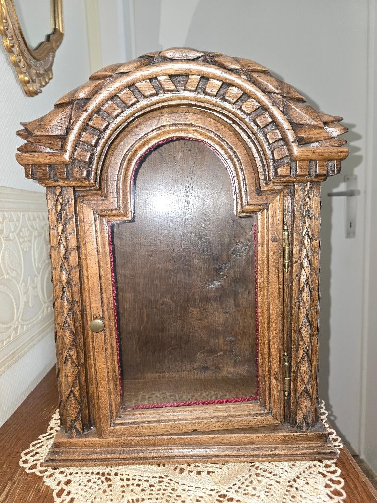21 feb 26ChristineMarke - Antiek houten vitrinekastjeCharmant pronkkastje (h 43 cm, b 32 cm) met mooi houtsnijwerk en intact glazen deurtje met houten frame. Kan zowel hangen als staan.Ophalen