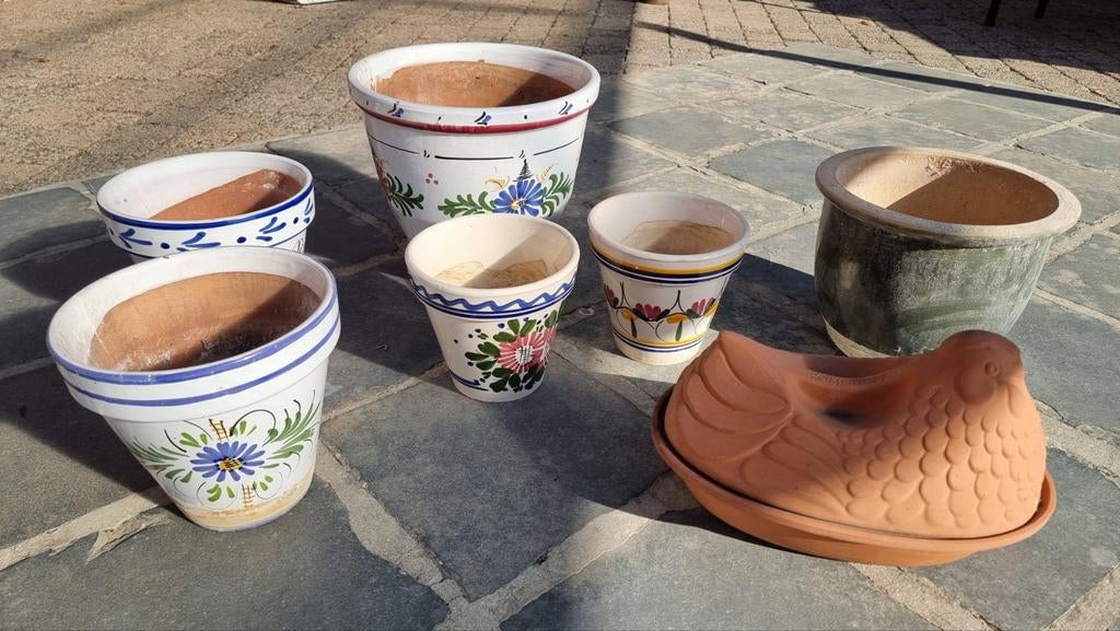 - BloempottenMooie spaanse bloempotten, verschillende maten. Grootste is 31cm hoog env34cm doorsnede. 25€ voor de spaanse, 8€ voor de groene en 5€ voor de kip indien apart.Ophalen