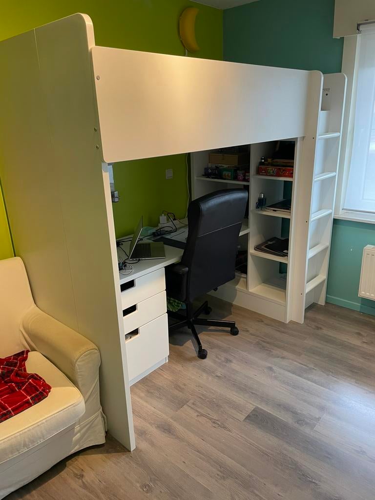 GisterenJeanneElsene - SMÅSTAD Hoogslaper, wit met frame/met bureau met 3 ladesSmåstad hoogslaper, wit met bureau kan in verschillende posities gemonteerd worden. Compleet met goede ikea matras. In nieuwstaat. Weg wegens aankoop tienerbed. Reeds gedemonteerd, op te halen in grooZo goed als nieuw Ophalen