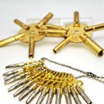 16 mei 25marcUkkel - Gereedschap voor klokken/horloges (3) - Volledige sleutelsetCompleet set horlogiesleutels van staal en messing uit het verenigd koninkrijk, daterend uit 2010–2020, met twee dikke sleutels met oneven cijfers (3–11), twee met even cijfers (2–10) en een volledige