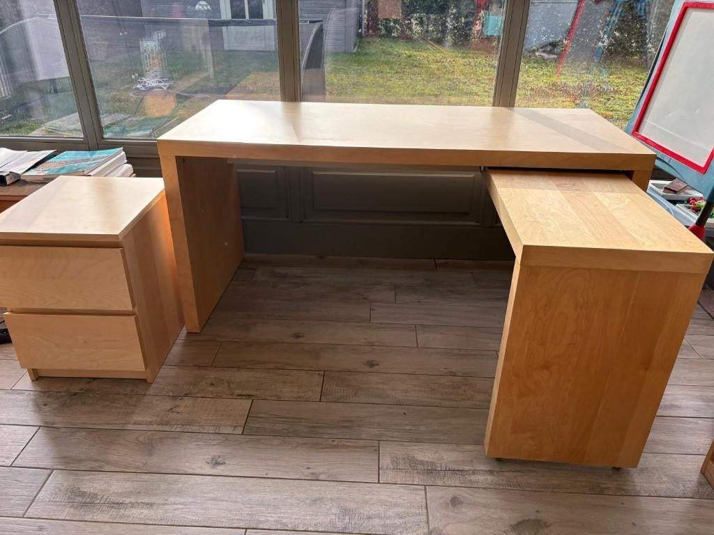 - IKEA Malm bureau met uitschuifbaar deel en ladenkastjeIkea malm bureau in licht eiken kleur - met uitschuifbaar gedeelte en apart ladenkastje. Bureau is 150l x 60d x 73h. Enkel op te halen te 3583 paal.Gebruikt Ophalen