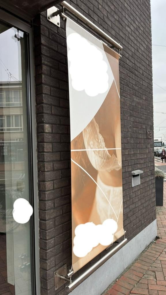 5 feb 26christof van hoyeDe Klinge - Ophangsysteem bannerMateriaal: inox alle bouten, schroeven, boven- en ondersteun ter beschikking excl. Bannner. Indicatie formaat banner: 90x202cmGebruikt Ophalen