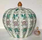 - Pot - Kalebas - PorseleinEen porseleinen voorraadpot, kalebas-model, uit 1970–1980, met afmetingen 25,5 cm hoog, breed en diep, in goede staat met geringe sporen van ouderdom. Een grote porseleinen voorraadpot mooi gedecoreer