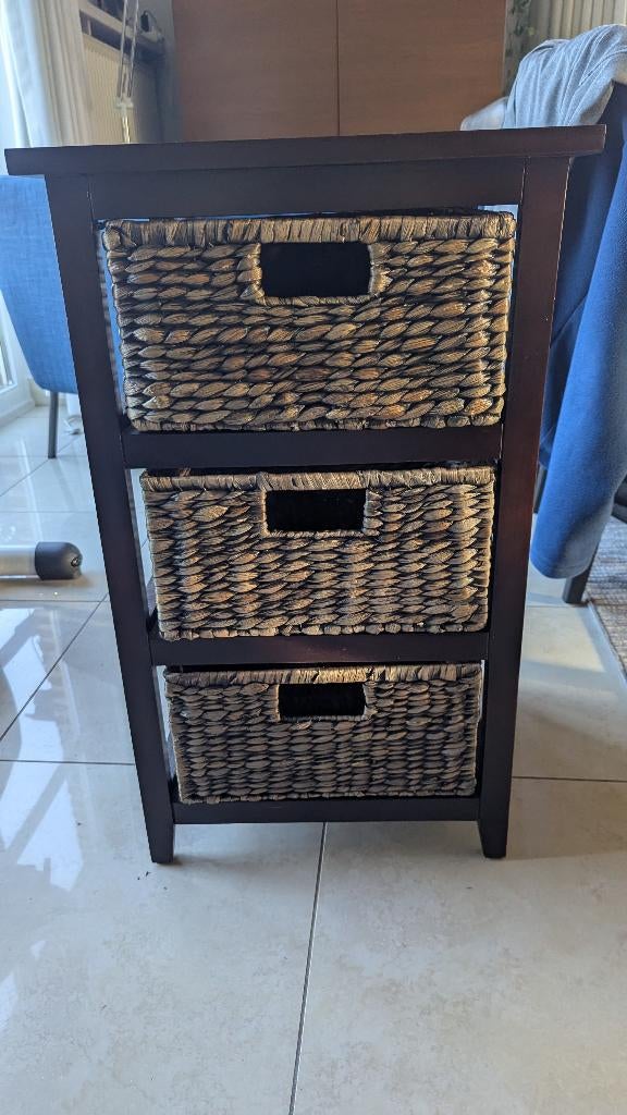 7 apr 26geert polflietLochristi - LadenkastjeMooi donkerbruin ladenkastje met drie rieten mandjes. Bovenblad heeft wat gebruikssporen maar verder in prima staat. Afmetingen: 42 (l) x 40 (b) x 69 (h) cm op te halen in lochristi.Gebruikt Ophalen