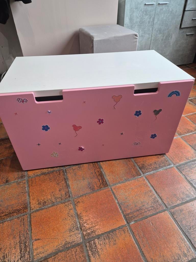 3 apr 26ZoéElsene - SpeelgoedkistIkea smastad speelgoedkist met kussentje om op te zitten. De schuif is lichtgroen en de kist zelf wit. Afmetingen: 90x52x48 cm.Zo goed als nieuw Ophalen