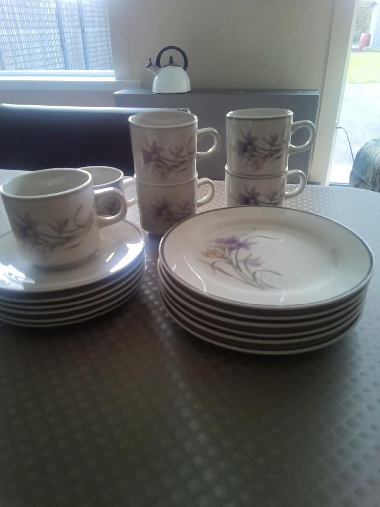 14 apr 26mevrDrongen - ServiesServies bestaande uit,11 koffietassen,12 onderzetters,12 dessertborden,12 soepborden,12 grote borden,sauspan, koffiepot, suikerpot, melkkan, onderschotel,kom met dekselGebruikt Ophalen