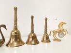VandaagzwembadmateriaalHeel België - Decoratieve bel - Set van klokken en figuren van messing -Drie bellen met figuren van koper en brons, geproduceerd in spanje, circa 1970–1980, 12 cm hoog, 6 cm breed en 4 cm diep, in goede staat met lichte ouderdomssporen. Set van 3 bellen met figuren in mes