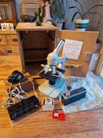 Zip (3ип) polystyrene box containing 2 lamps, 5 lenses, one green filter, one grid filter and 2 rings kyowa tokyo polystyrene box containing lamp compartiment, 4 lenses, some rubber gaskets and screw links and head with double ocular remnants of an m...