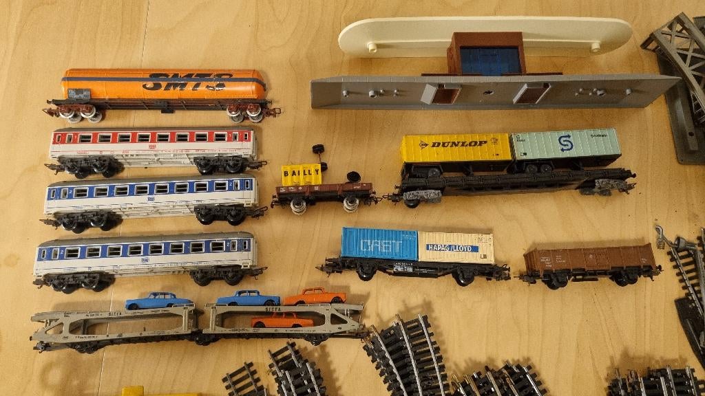 - lima treinen5 locomotieven 2goederen stations 1interflora 1tunnel 1huisje 1goederenwagon :ovomaltine 2goederenwagons:mobiloil 1autotransport 1vrachtwagenwagon 1staufen brau 1bar corail 1wissel plateau 1garage 8miOphalen of Verzenden