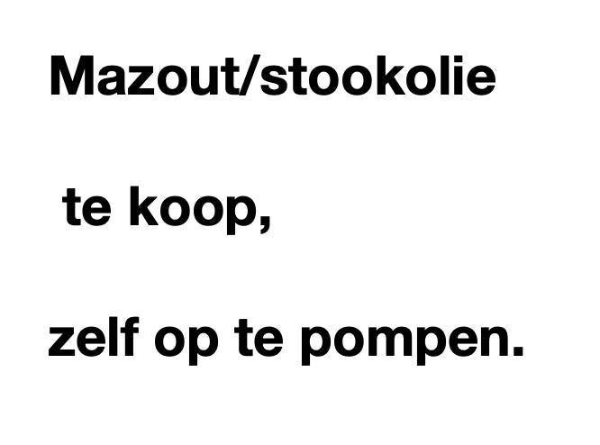 - Stookolie / mazoutWegens omschakeling van mazout naar warmtepomp hebben wij +/- 1000 liter mazout te koop (zelf op te pompen in ondergrondse tank) in 9280 lebbeke. Bij interesse, doe een eerlijk bod.Ophalen