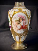 - Vaas - Boheemse emailglas - melkglas/ondoorzichtig glas -Extravagante historismus-vaas uit bohemen, circa 1870, rijk verguld met fijne email-schilderingen op een melkglas-opaak glazen lichaam, met een metalen montagestuk aangebracht rond 1900; afmetingen 30