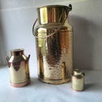 3 mrt 26TopadvertentieCatawikiHeel België - Melkkan (3) - Messing - Melkbussen met dekselsEen vintage set van drie messing melkflessen in hollandse stijl uit 1940–1950, bestaande uit een grote bus (romphoogte 37 cm, totale hoogte met handvat 52 cm, diameter 21 cm, gewicht 1400 g) met geham