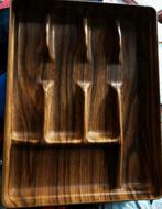 - Robex vintage 70's keuken bestekbak in imitatie melamineVintage franse mid century disign keuken bestek opslag draw door robex in faux houten kleur melamine met 5 compartimenten, retro 1970s keukengerei afmeting 33.50Cm x 26 cm x 4,30cm hoog in uitstekendeOphalen of Verzenden