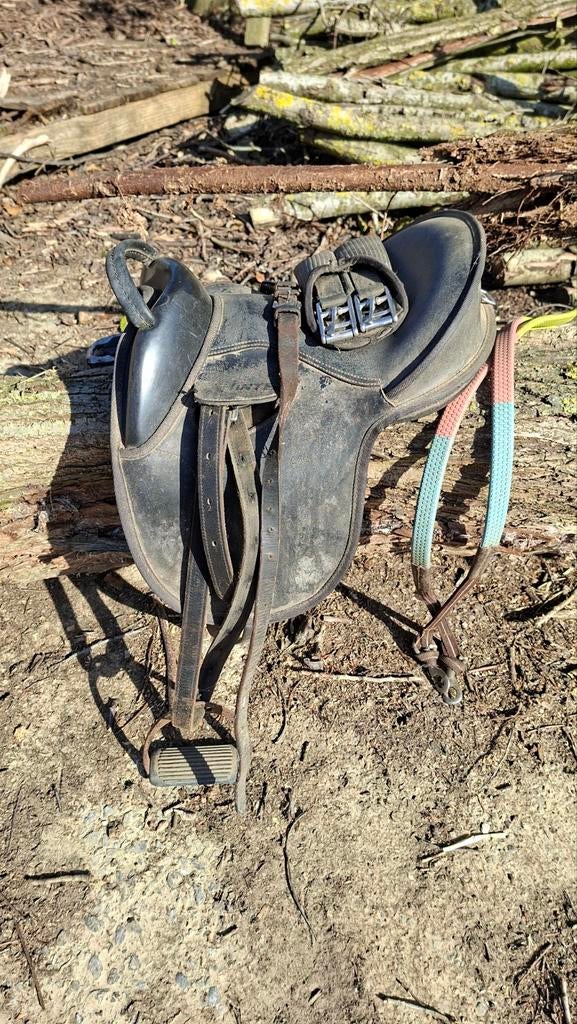 - wintec kids zadeltje + benodigdhedenWintec kids zadeltje + benodigdheden alles voor het opzadelen en rijden van een (mini)shetlander. Zadeltje, stijgbeugels en riemen, staartriem, singeltje van 40 cm, teugeltjes, hoofdstelletje, bitje.Gebruikt Ophalen