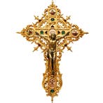 25 dec 25CatawikiHeel België - Crucifix - Legering - 1950-1960 - Neobarroco - 52 cmWandkruis van brons / vergulde legering in neobarokke stijlhet presenteert weelderige voluten, laciaturen en cabochons met ingesloten stenen. Dit alles levert een klassiek chromatisch contrast op in d