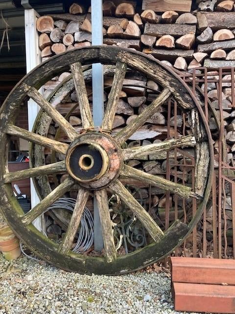 21 okt 25parts.dekempenWeelde - Drie oude houten spaakwielen met ijzeren rand, decoratiefSet van drie originele houten spaakwielen afkomstig van een oude boerenkar. De wielen hebben een prachtige verweerde uitstraling met ijzeren randen en een robuuste houten kern. Perfect voor decoratie,Ophalen