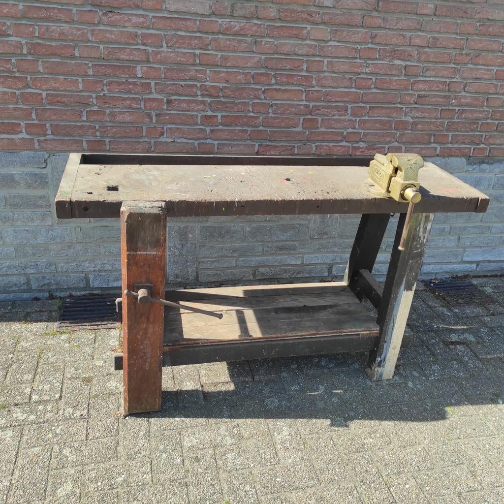 EergisterentomLier - Oude massieve werkbank met bankschroef – uniek stukZeer stevige en authentieke houten werkbank in massief hout. Voorzien van een originele bankschroef en onderplank voor extra opslag. Deze werkbank heeft een prachtige doorleefde uitstraling en is perfGebruikt Ophalen