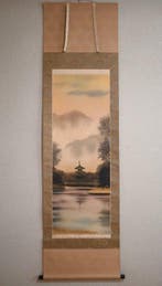 19 apr 26TopadvertentieCatawikiHeel België - Een blik op een oude tempel bij schemering -Antiek uit de shwa-periode landschaps-hangende rol van kawahara susumu, met de hand geschilderd op zijde, 197,7 cm hoog × 54,3 cm breed, voorstellend de vijfverdiepingstoren van kofuku-ji in nara, ges
