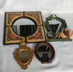 - Themacollectie - spiegelSet van vier decoratieve spiegels in barok geïnspireerde stijl uit de late twintigste eeuw, vervaardigd uit verschillende materialen, met onder meer een houten wandspiegel van 22 × 15 × 2 cm, een lere