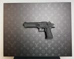 - Daluxe Art - 1999 • Luxury PistolDaluxe art presenteert 1999 • luxury pistol, een 3d aluminium pop-art wandobject uit 2024, oplage 7/25, met handtekening, afmetingen 40 x 50 cm (dikte 5 cm) en een matte achtergrond met het lv-monogra