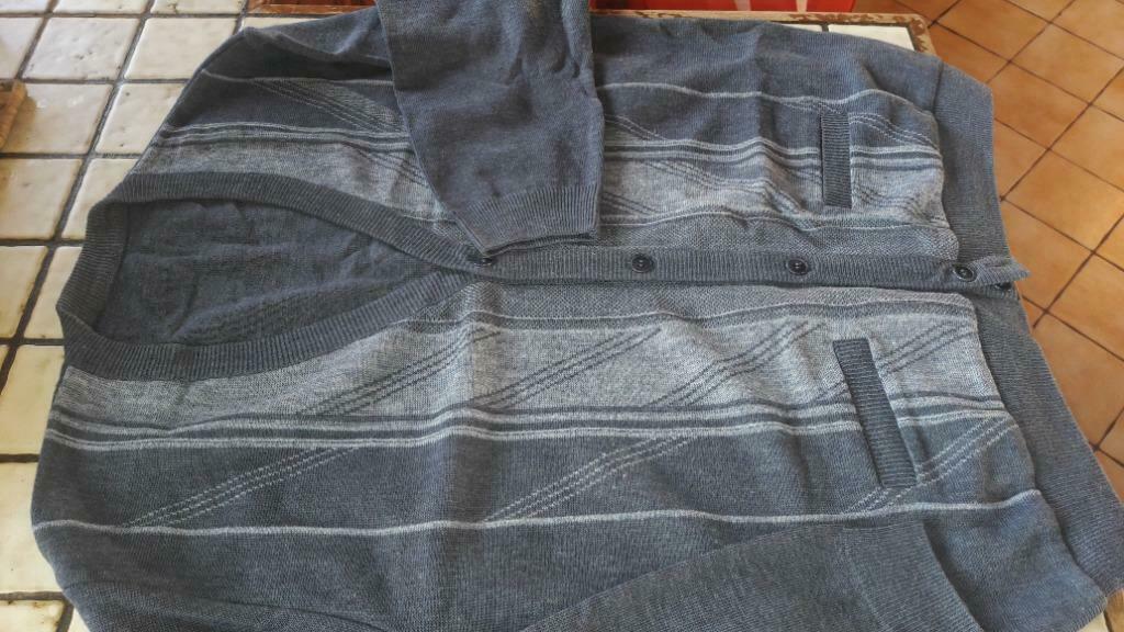 24 aug 24valWavre - Pull homme à rayures bleu clair et gris col polo boutonné TaTrès bon état mais quelques peluches à retirer, pas d étiquette, la matière ressemble beaucoup à de la laine mesure à plat épaule 48, largeur sous aisselles 62, longueur dos 70, bras 61 joli pull à raZo goed als nieuw Ophalen of Verzenden