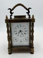 - Rijtuigklok - Antiek Brons, Glas, Emaille - 1980-1990Antiekgroei bronzen rijtuigklok met glazen panelen, een mechanisch uurwerk, meerdaags uurwerk, en een halfuurlijke bel, die tijd en volledige kalender (weekdag en datum) toont op een romeinse cijfers