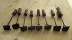 - Werkgereedschap (8)Acht antieke brandijzers met houten handgrepen, circa 24–28 cm lang, afmetingen circa 27 cm breed bij 5 cm hoog en 5 cm diep, gewicht 1.380 G, herkomst onbekend, in redelijke staat met zwaar gebruik e