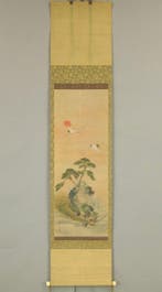 - Mount Hourai (Mount Penglai) Eternal Youth Landscape RisingOkamoto toyohiko, japanse schilder uit de late edo-periode, met handtekening op een zijden kakejiku met mount hourai en eeuwige jeugdlandschap met stijgend zon, reigers, dennen en schildpad; 160,8 cm