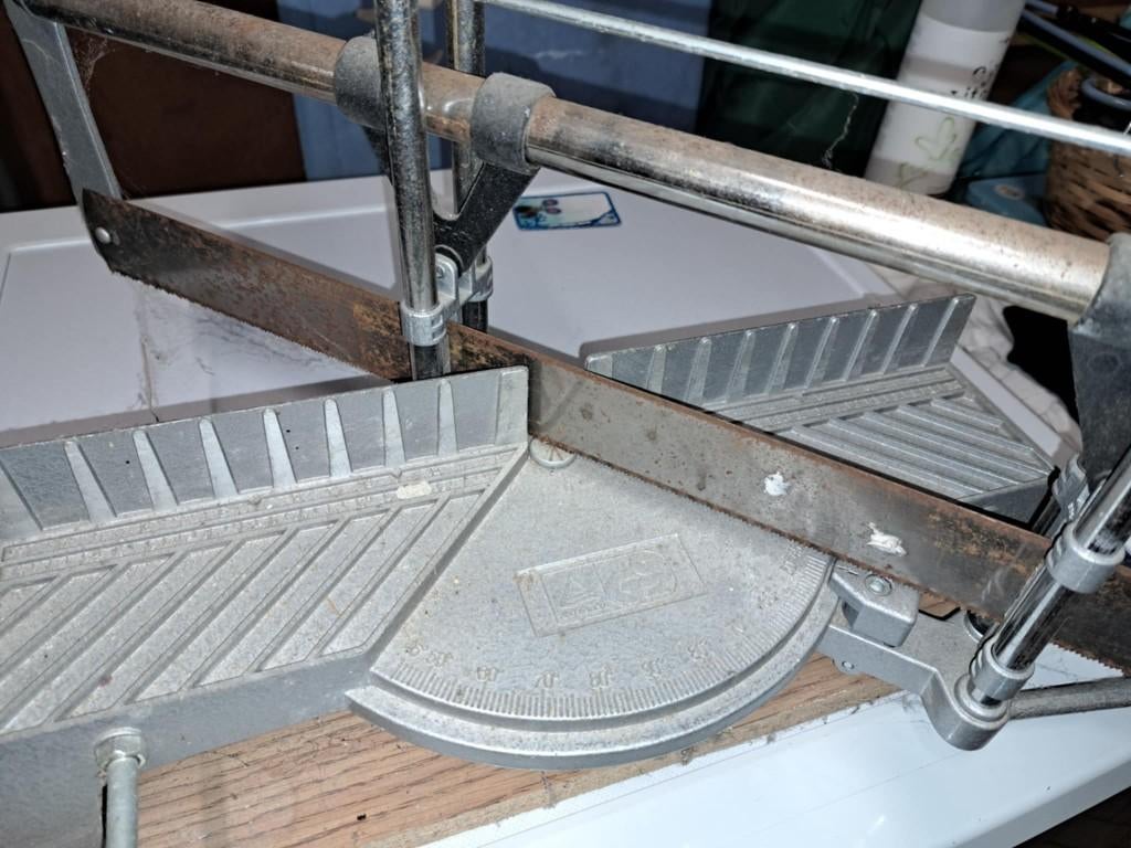 - Handmatige verstekzaagTe koop: een handmatige verstekzaag-inrichting, beter bekend als een verstekbak (mitre box) met geleide zaag. Een metalen, verstelbare verstekbak (dus geen simpel houten blokje). Met geleidestangen waGebruikt Ophalen