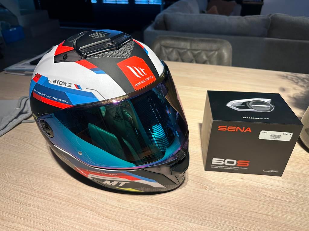 15 apr 26Topadvertentienonstoprecords.nlTeuven - Motohelm MT Atom 2 + Sena 50s Harman Kardon luidpsrekerMotorhelm van het merk mt atom 2 maat xl. Shaded vizier met blauw/paarse kleur en voorzien met pinlock om aandamping te voorkomen. Origineel vizier zit erbij. Staat is gloednieuw! Inclusief sena 50s hTweedehands Ophalen