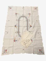 - Handgeborduurd linnen tafellaken met zes servetten -Handgeborduurd linnentafellaken met zes servetten, daterend uit 1970–1980, in goede staat, afmetingen 175 x 120 cm, vervaardigd in europa. Elegante collectie vintage linnen tafeltextiel, met fijn hand