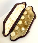 12 apr 26CathleenMaaseik - Doos - Victoriaanse parelmoeren heren-studset in origineleVictoriaanse herenstuderset van parelmoer met vergoldde metalen bevestigingen, geleverd in het originele burgundy maroquineklemmetasje in een kussenvormig koffer, daterend uit de late negentiende eeuw