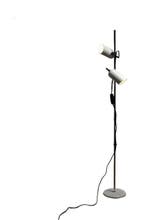 GisterenTopadvertentieCatawikiHeel België - Staande lamp - Staal, Metaal - Duo-SpotEen moderne vloerlamp uit de jaren zeventig met een chromen steel, witte ronde voetplaat en twee afzonderlijk verstelbare richtspots, 140 cm hoog met een 19,5 cm bij 19,5 cm basis in goede vintage sta