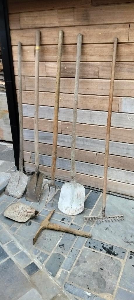 7 dec 24IsabelleLembeek - oud tuingereedschap – vorken, schoppen, hak, kantensteker...Partij degelijk ouder tuingereedschap, meeste nog prima bruikbaar. Bevat o.a.: Metalen schoppen hooivorken kantensteker hak kleine cultivator oude ijzeren bijlkop, stevig maar met wat roest — op te knOphalen