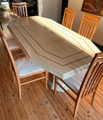 15 aug 25chrisGlabbeek-Zuurbemde - Travertin eettafel + 6 stoelenTravertin eettafel lengte 215 cm breedte 105cm voor 6 tot 8 personen + 6 stoelenZo goed als nieuw Ophalen Vijf personen of meer