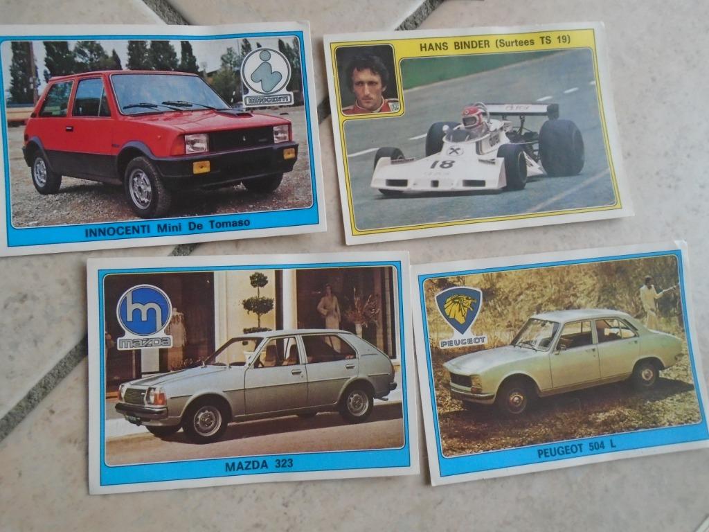 10 apr 26nodelvernonKoksijde - 4 KAARTEN VOOR „SUPER AUTO” ALBUM+ 2 MOTORKAARTEN+2 AUTO'S4 kaarten voor album super auto figure panini /gedrukt in italië door edizioni panini modena -peugeot 504 linnocenti mini van tomaso -hans binder surtees ts 19 -mazda 323 1 fotokaart motomv 350 scrambOphalen of Verzenden