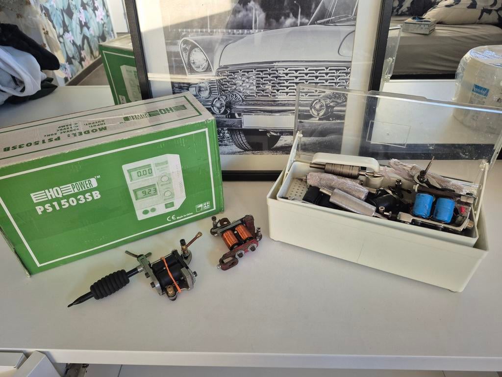 - Tattoo en piercing benodighedenHa power bron meerdere tattoo machines reguler power supply power bron met foot switch meerdere doosjes met gesloten naalden clipboard sleves transfer paper + solution volle doos met bekers, inkt potjOphalen