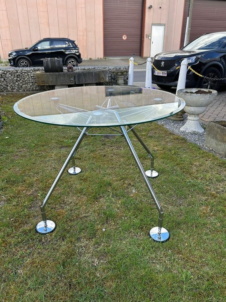 - Tecno Nomos tafel van 120 cmTecno nomos tafel in goede staat. Diameter 120 cm. Het chroom brokkelt een beetje af op de voet, er zit een kleine chip op het glaspaneel (een cirkel van + - 2 mm). Op te halen in charleroi.Gebruikt Ophalen