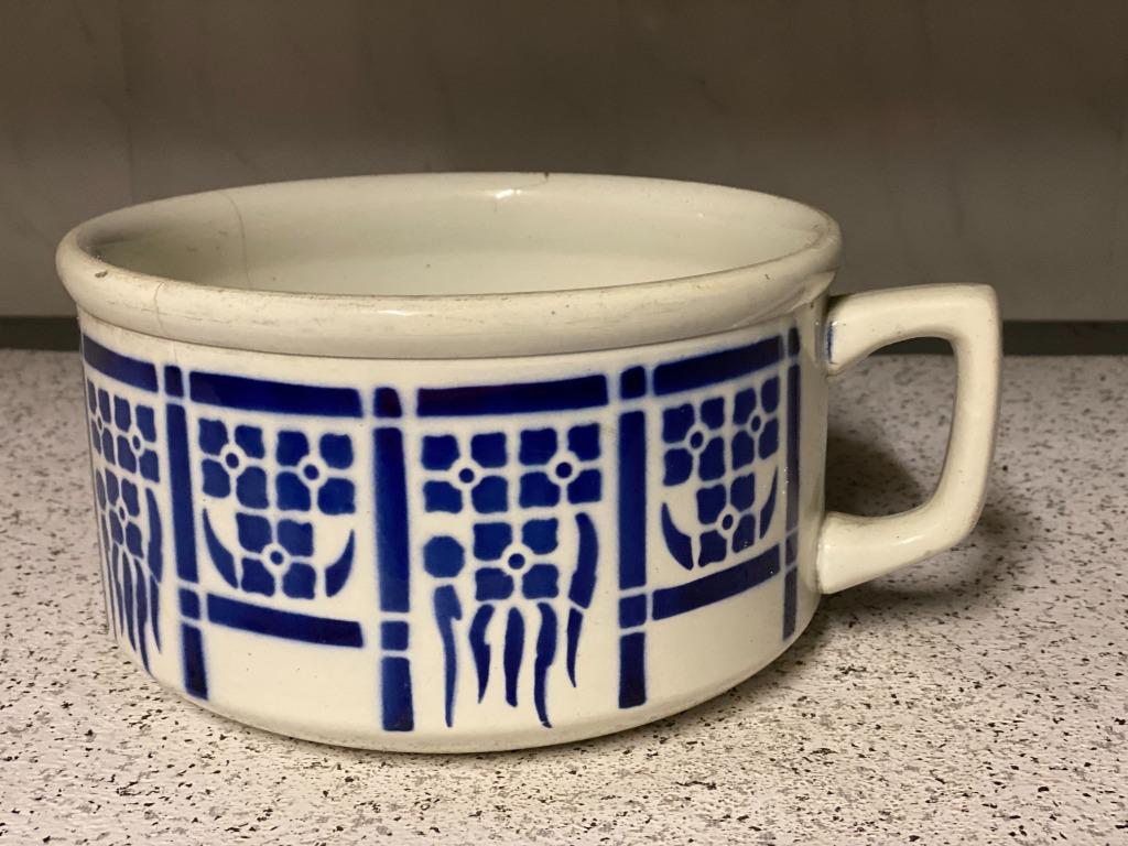 13 apr 26foggiatoGerpinnes - Porseleinen nachtpot/po St AmandBeige franse nachtpot in porselein met een handvat.. Bovenaan een brede rand. Rondom is er een blauw retro tekening met bloemen, strrepen en vakjes. Heeft 2 barsten (zichtbaar in de pot) en ouderdom cOphalen