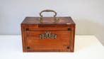 GisterenStevieBrugge - Doos - Wortelhoutfineer - theedoosNederlandse theedoos in hollands louis xv-stijl, gedateerd 1850–1900, met wortelhoutfineer, koperen-handvat en slot, mahoniefineer op eikenhout, afmetingen circa 11 × 18,7 × 10,7 cm, afkomst nederland