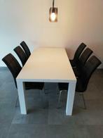 - Rechthoekige tafel en 6 stoelenEen wit gelakte gelakte houten tafel. Afmetingen: 1.80M lang. Breedte van 90cm. Hoogte 73cm. Vergezeld door 6 stoelen met metalen poten. Zwarte stof met gebreken, klauwsporen (katten) op alle stoelenGebruikt Ophalen