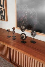 VandaagTopadvertentieCatawikiHeel België - NO RESERVE PRICE - Spinning tops (3) - Gasing - Toupie -Ensemble de trois toupies en bois provenant de lombok, indonésie, datant de 2020+, avec supports en métal sur mesure, emballé dans une boîte en carton marron, dimensions environ 27 cm de haut sur 12 c