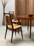 - Stoel - Hout, Textiel - Eettafel & 4 stoelenEen duitse eetset uit de jaren 1960, bestaande uit een uitschuifbare ronde eettafel en vier stoelen, vervaardigd uit hout met stoffen bekleding, met tafelafmetingen 100–148 cm in diameter en 74 cm hoo